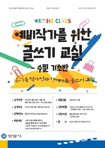 한편 석수도서관에서는 일반 시민을 대상으로 「예비작가를 위한 글쓰기 교실」을 운영한다. 수필이론 학습과 실습 과정으로 구성된 ‘수필 기초반’을 거쳐 심층적 작품 분석 및 개별 창작물 완성 과정을 지도하는 ‘심화반’까지 단계적 수업이 이뤄지며, 수필 ‘신호등’의 저자인 홍미숙 작가의 지도 첨삭을 받을 수 있다.