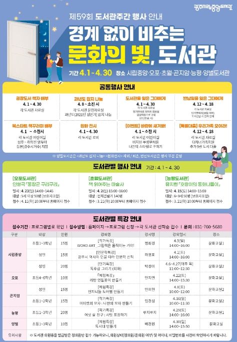[ 타임즈 - 김시창 기자 ] 광주시립중앙도서관은 4월 ‘제59회 도서관 주간 및 4월 12일 도서관의 날’을 맞아 '경계 없이 비추는 문화의 빛, 도서관'을 주제로 다양한 독서문화행사를 펼칠 예정이다.