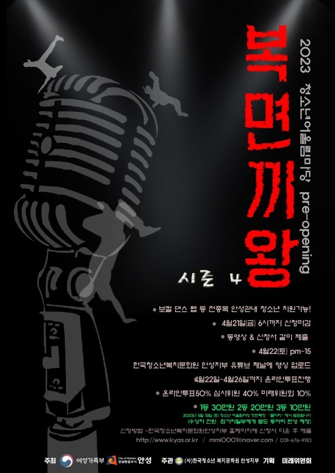 (사)한국청소년복지문화원 안성지부는 2023 안성시청소년어울림마당 pre-opening “복면끼왕 시즌 4”를 개최한다고 밝혔다.