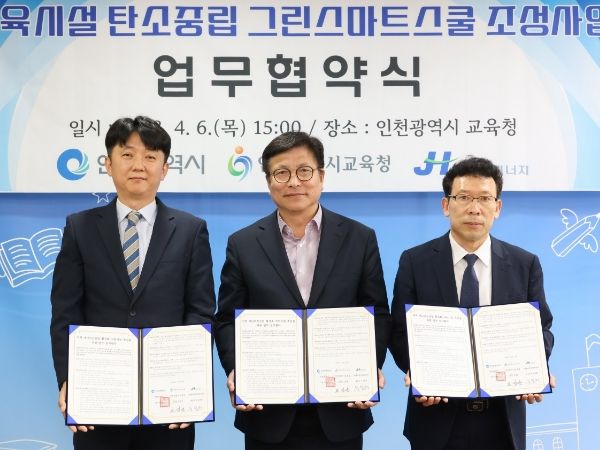 [ 타임즈 - 김시창 기자 ] 인천광역시교육청은 학교 유휴공간을 활용한 교육시설 탄소중립 그린스마트 스쿨 조성을 위해 인천광역시, 주식회사 제이에이치에너지와 업무협약을 체결했다고 10일 밝혔다.