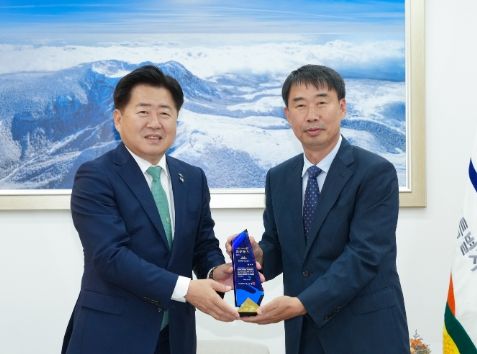 오영훈 지사는 21일 오후 2시 40분 도청 집무실에서 전재목 제주지방기상청장에게 명예도민패와 명예도민증을 전달했다.