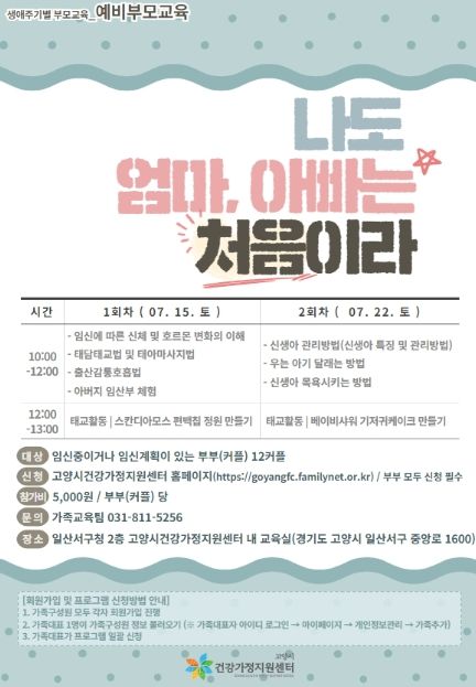 [ 타임즈 - 김시창 기자 ] 고양특례시 건강가정지원센터는 오는 7월 15일(토), 22일(토) 10시부터 일산서구청 2층 교육실에서 예비부모를 위한 ‘나도 엄마,아빠는 처음이라’ 교육을 진행한다.