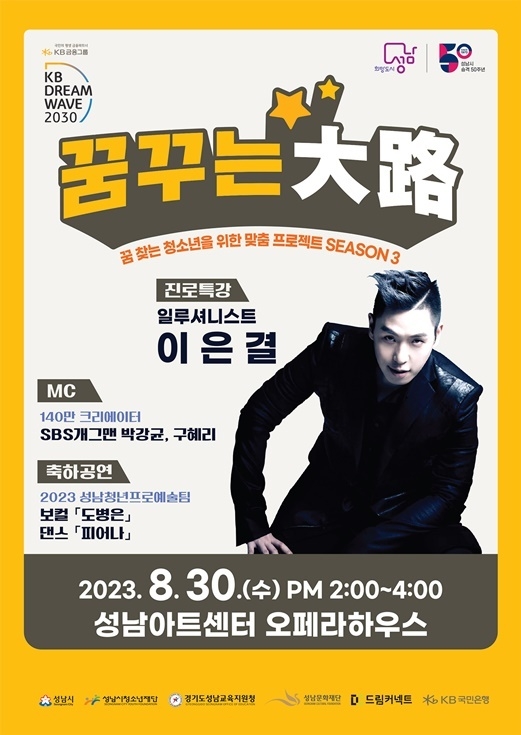 이번 프로젝트는 성남시 청소년 1,500명을 대상으로 ‘경계를 넘어 새로운 가능성으로’의 주제로 진로특강과 다양한 문화공연을 제공하며, KB국민은행의 대표 사회공헌 사업인 국내 최고 멘토의 청소년 진로 콘서트 ‘꿈꾸는 大路[대로]’사업과 연계하여 펼쳐지게 된다.