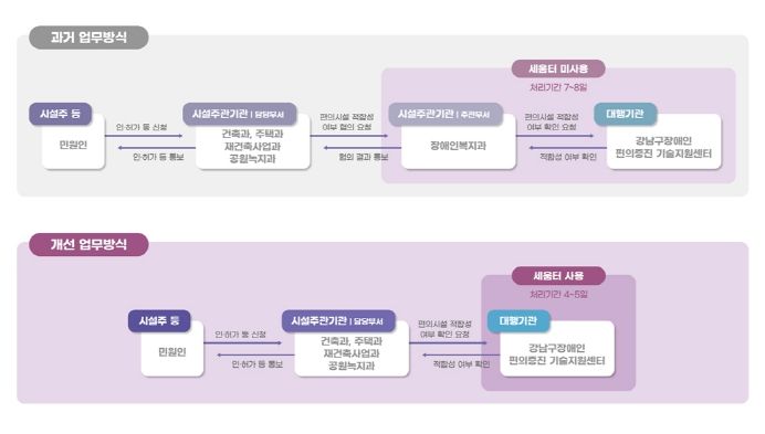 시설주가 시설물에 대한 인허가 신청을 하면, 담당 부서(건축과·주택과·재건축사업과·공원녹지과)는 과거 방식대로 장애인복지과로 장애인 편의시설 적합성 여부에 대한 협의 요청 공문을 보낸다. 그러면 장애인복지과에서 대행기관인 강남구장애인편의증진기술센터(이하 센터)로 확인 요청을 하게 된다. 하지만 센터는 실질적인 업무처리가 이뤄지는 건축행정 시스템인 세움터의 권한을 부여받지 못해, 장애인복지과 담당자가 세움터에 접속해 센터에서 요청하는 설계도면과 자료를 일일이 내려받아 보내줘야 했다.