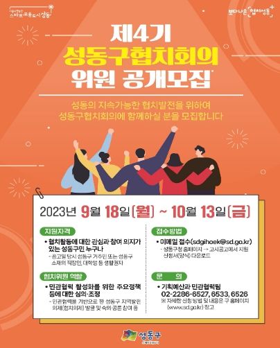 [ 타임즈 - 김시창 기자 ] 서울 성동구가 오는 10월 13일까지 총 26일간 지속가능한 민관협치 정책의 비전을 제시하고 함께 실현해 나갈 제4기 성동구협치회의 민간위원을 공개모집한다.