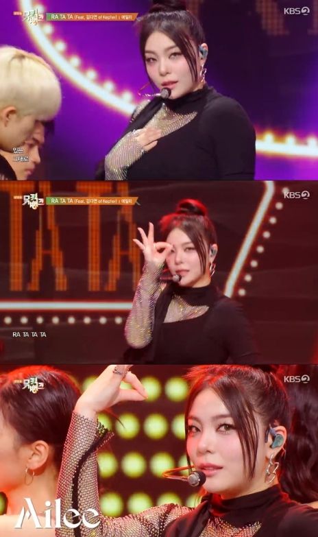 에일리는 13일 오후 방송된 KBS 2TV ‘뮤직뱅크’에 출연해 새 싱글 앨범 ‘RA TA TA(라 타 타)’의 동명의 타이틀곡 ‘RA TA TA (Feat. Lil Cherry)’ 무대를 펼쳤다.
