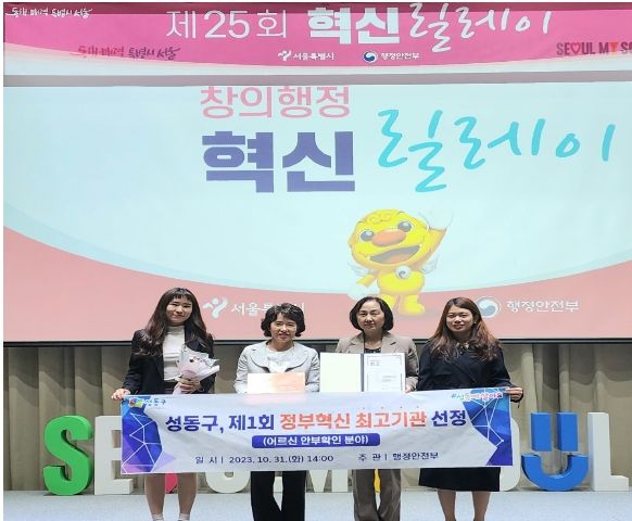 정부혁신 최고기관은 국민 편의 및 안전성, 행정 효율성 등을 개선한 혁신사례를 최고로 잘 운영하는 기관에 부여하는 인증으로, 성동구는 민·관 협력을 통한 촘촘한 인적안전망과 스마트기술을 활용한 위기·응급상황 예방 및 신속대응으로 어르신 안부확인 분야에서 최고로 선정됐다.