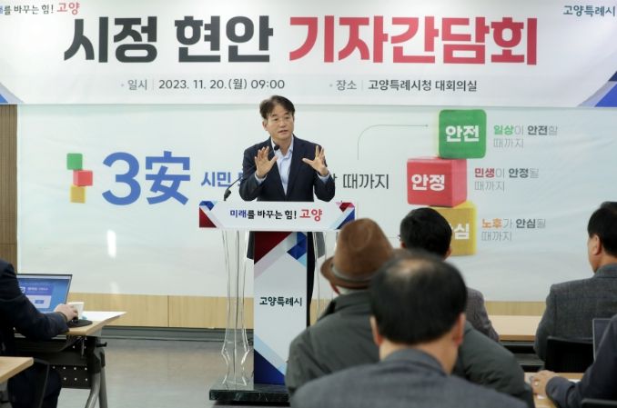 [ 타임즈 - 김시창 기자 ] 이동환 고양특례시장은 20일 고양시청 열린시장실에서 시정 현안 기자 간담회를 열고 시민에게 꼭 필요한 5대 사업 분야 추진을 위한 2024년 본예산안 편성 방향을 밝혔다.