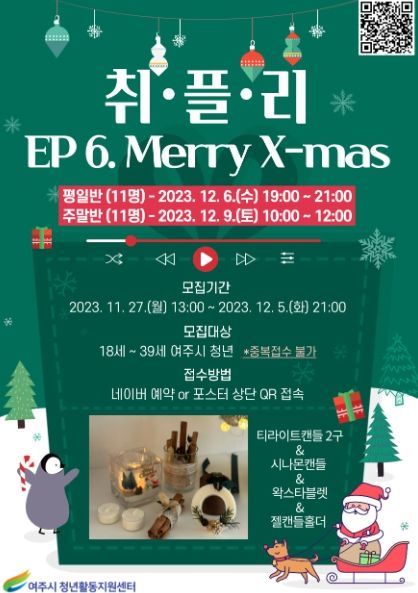 [ 타임즈 - 김시창 기자 ] 여주시 청년활동지원센터는 오는 12월, 크리스마스를 기념해 여주시 청년들을 위한 ‘취미플레이리스트 MERRY X-MAS(이하 취플리)’ 프로그램을 진행한다고 밝혔다.