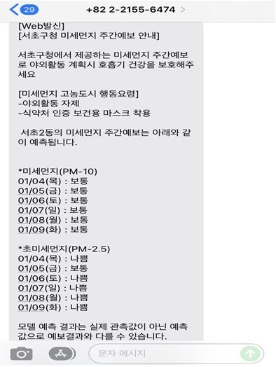문자 내용은 ▲해당 동의 미세먼지, 초미세먼지 수치 ▲미세먼지 고농도시 행동요령 등 미세먼지 관련 지역별 맞춤형 정보다. 문자 수신일 다음 날부터 6일 간의 미세먼지 정보를 지속적으로 제공한다.