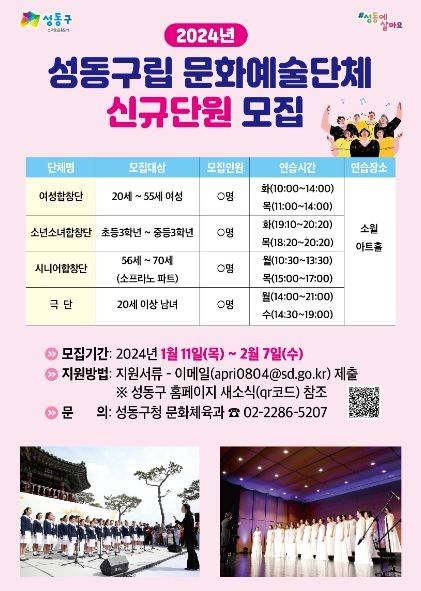 정원오 성동구청장은 "스마트 문화도시 성동에서 구립 문화예술단체 단원으로 함께할 재능있고 열정 가득한 분들의 관심과 참여를 바란다"라며 "앞으로도 구민들의 일상 속 문화 향유와 지역문화 발전 지원에 더욱 힘쓰겠다"라고 전했다.