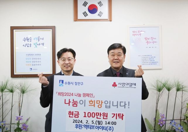 이상수 장안구청장은 “해마다 잊지 않고 이웃사랑에 동참해 주신 엑티브아이티㈜ 임직원 여러분들께도 깊이 감사드리며, 기부금은 어려운 이웃들이 따뜻한 설 명절을 보내실 수 있도록 잘 전달하겠다”라고 전했다.