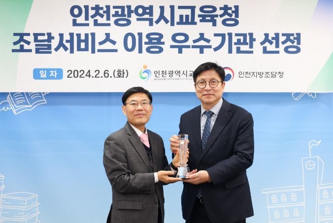 강신면 인천지방조달청장은 이날 인천시교육청을 방문해 우수기관 트로피와 표창장을 수여하고 조달서비스 이용에 감사의 뜻을 표했다.