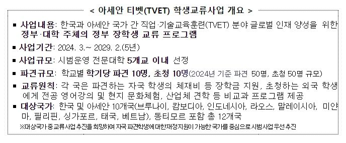 ‘아세안 티벳(TVET) 학생교류사업’은 한-아세안 고등직업교육기관 간 동반관계(파트너십) 조성과 전문기술분야의 글로벌 인재 양성을 목표로 한-아세안 전문대학 간 학생 교류를 지원하는 사업이다.