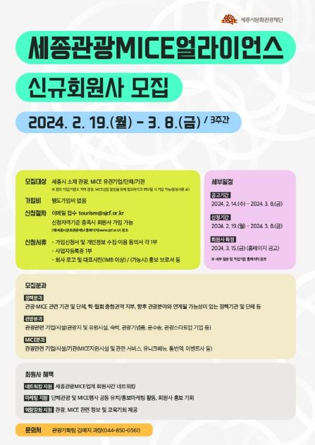 [ 타임즈 - 김시창 기자 ] (재)세종시문화관광재단은 세종시 관광·MICE 산업 발전을 위한 민관 협의체로 ‘세종관광MICE얼라이언스’를 발족하고 신규 회원사를 모집한다.