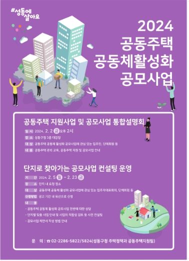 [ 타임즈 - 김시창 기자 ] 서울 성동구는 공동주택 입주자 간 나눔과 소통의 장을 마련하고 지역과 화합하는 건강하고 살기 좋은 공동체 문화를 조성하기 위해 ‘2024년 공동주택 공동체 활성화 및 지역공동체 공모사업’을 추진한다.
