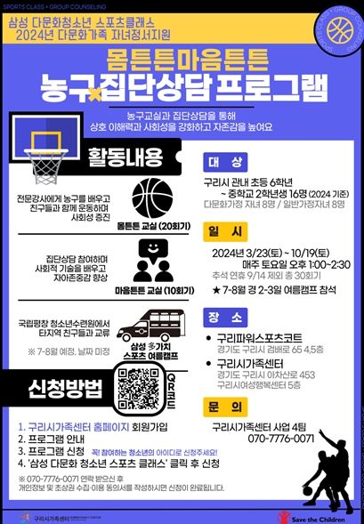 [ 타임즈 - 김시창 기자 ] 구리시 가족센터는 2024년 세이브더칠드런 '삼성 다문화청소년 스포츠 클래스' 참여기관에 선정되어, 구리시 청소년의 자존감 향상 및 긍정적인 또래 관계 형성을 위한 농구 수업 및 집단상담 프로그램을 추진한다.