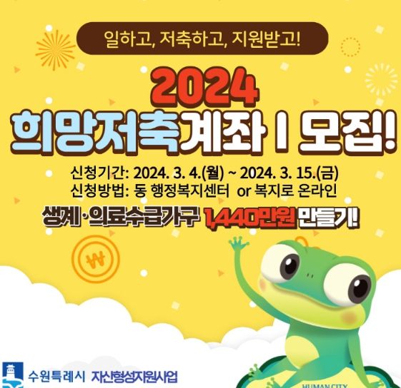 [ 타임즈 - 김시창 기자 ] 수원시는 3월 15일까지 ‘희망저축계좌Ⅰ’ 신규 가입자를 모집한다. 근로·사업소득이 있는 생계·의료 수급 가구가 희망저축계좌Ⅰ에 가입할 수 있다.