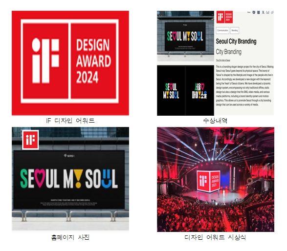 ‘SEOUL MY SOUL(서울마이소울)’은 올해 iF 디자인 어워드 수상작 중 ‘도시 브랜드’로는 유일한 것으로 알려졌다. 시가 지난해 8월 새 브랜드 발표 이후 약 반년 만에 이뤄낸 쾌거로, 이제 ‘SEOUL MY SOUL’은 서울시민을 넘어 세계인의 마음속에 각인될 브랜드로 인정받게 됐다.