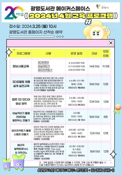 [ 타임즈 - 김시창 기자 ] 광명시 광명도서관은 오는 25일부터 메이커스페이스 4월 교육프로그램 수강생을 모집한다.