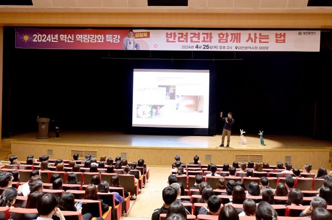 [ 타임즈 - 김시창 기자 ] 대전시는 25일 오후 3시 대전시청 대강당에서 강형욱 훈련사를 초청해‘반려견과 함께 사는 법’이라는 주제로 올해 첫‘2024년 혁신 역량강화 특강’을 개최했다.