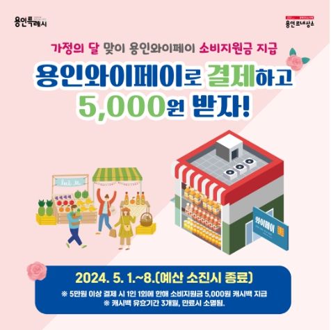 행사에서는 용인와이페이 카드로 5만원 이상 결제 시 소비지원금 5000원을 즉시 지급한다. 지급 내역은 경기지역화폐 앱을 통해 확인할 수 있고 유효기간 3개월 안에 용인와이페이 가맹점에서 결제 시 사용하면 된다.