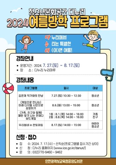 [ 타임즈 - 김시창 기자 ] 인천광역시교육청중앙도서관 청소년문화공간 다누리는 7월 27일부터 8월 17일까지 ‘2024년 여름방학 청소년 프로그램 - 다누리에서 누리는 리(이)번 여름’을 운영한다.