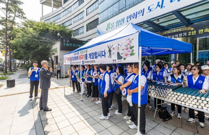 이날 행사는 윤환 계양구청장을 비롯해 한국자유총연맹 회원 60여 명이 참여한 가운데 진행됐으며, 회원들은 가정용 태극기 1,000개와 차량용 태극기 1,000개를 구민에게 무료로 나눠주며 태극기 달기 운동을 전개했다.