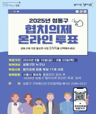 [ 타임즈 - 김시창 기자 ] 서울 성동구는 8월 16일부터 22일까지 2025년 성동구 협치의제 선정을 위해 온라인 주민 투표를 실시한다.