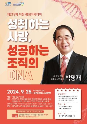 [ 타임즈 - 김시창 기자 ] 이천시는 오는 25일 오후3시, 이천아트홀 소공연장에서 박명재(전 행정자치부장관, 제19·20대 국회의원)을 초청해 ‘성취하는 사람, 성공하는 조직의 DNA’를 주제로 '제219회 이천 평생아카데미'를 개최한다.