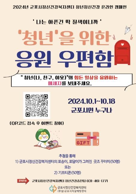 [ 타임즈 - 김시창 기자 ] 군포시정신건강복지센터에서 ‘정신건강의 날(10월 10일)’을 앞두고 온라인 캠페인 ‘청년을 위한 응원우편함’을 진행한다.
