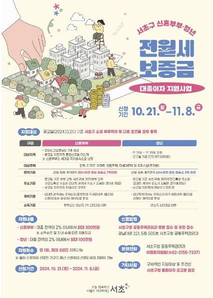 [ 타임즈 - 김시창 기자 ] 서울 서초구가 신혼부부와 청년들의 주거 안정성을 높이기 위한 전월세 보증금 대출이자 지원사업 신청자를 모집한다.