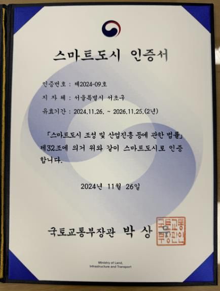 [ 타임즈 - 김시창 기자 ] 서울 서초구가 국토교통부 주관 ‘2024년 스마트도시 재인증 공모’에서 스마트도시 재인증을 획득했다고 23일 밝혔다.