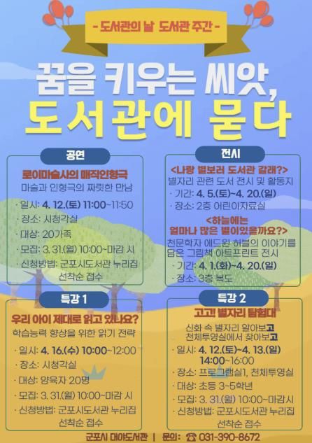 행사의 수강신청은 3월 31일 10시부터 군포시도서관 누리집에서 선착순으로 진행하며, 전시는 도서관을 방문한 누구나 관람할 수 있다. 자세한 내용은 군포시도서관 누리집 공지사항을 확인하거나 대야도서관으로 문의하면 안내받을 수 있다.