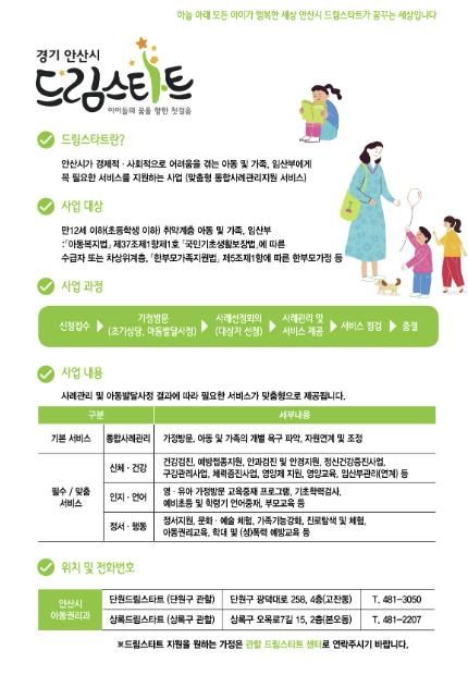 한편, 안산시 드림스타트는 12세 이하(초등학생 이하) 취약계층 아동 및 가족, 임산부를 대상으로 통합사례 관리 및 보건, 복지 등 맞춤형 통합서비스를 지원하고 있다.