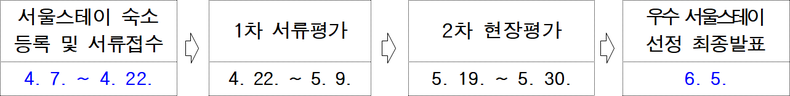 □ 시는 1차 서류평가와 2차 현장평가를 거쳐 6월 5일(목)에 서울스테이 누리집에서 올해 우수 서울스테이 20개소를 최종 발표할 계획이다.