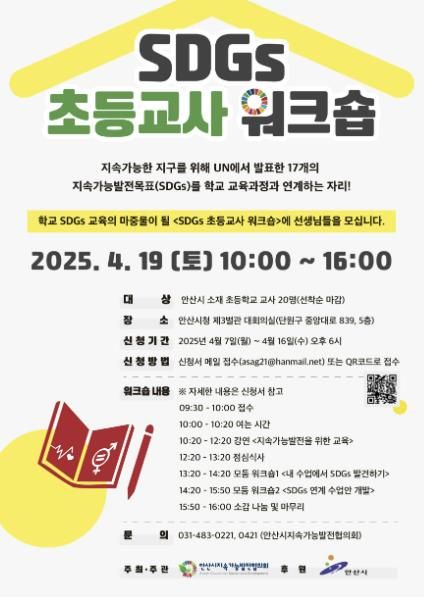 이번 워크숍에 참여를 원하는 교사들은 오는 16일 오후 6시까지 안산시지속가능발전협의회 누리집에 게시된 신청서를 작성해 전자우편이나 홍보자료의 QR코드로 접수하면 된다. 자세한 사항은 안산시지속가능발전협의회로 문의하면 안내받을 수 있다.
