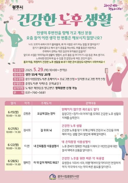 광주시립중앙도서관 관계자는 “삶의 전환기를 맞은 시민들에게 실질적인 도움이 되는 내용으로 구성했다”며 “보다 많은 시민이 이번 특강을 통해 건강하고 의미 있는 노후를 준비하는 계기가 되길 바란다”고 전했다.