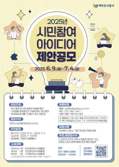 [ 타임즈 - 김시창 기자 ] 여주도시공사는 오는 6월 9일부터 ‘2025년 시민참여 아이디어 제안 공모’를 진행한다고 밝혔다. 이번 공모는 시민과 함께하는 열린 행정 실현과 공사 사업의 지속 가능한 발전을 도모하기 위해 마련됐다.
