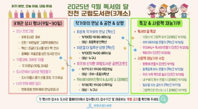 [ 타임즈 - 김시창 기자 ] 충북 진천군립도서관은 9월 독서의 달을 맞아 오는 9월 9일부터 진천군립·생거진천혁신도시·광혜원 도서관 관내 3개소에서 독서문화 활성화를 위한 다양한 프로그램을 선보인다.
