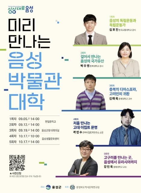 이후 △(2회차, 9.12.) 걸어서 만나는 음성의 국가유산(충북대학교 박주영) △(3회차, 9.19.) 충북의 디아스포라, 고려인의 귀환(충북대학교 김태옥) △(4회차, 10.17.) 처음 만나는 고대 이집트 문명(한국이집트학연구소 곽민수) △(5회차, 10.17.) 고구려를 만나는 곳, 음성에서 유라시아까지(경희대학교 강인욱) 등의 강좌가 이어진다.