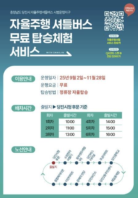 운행 노선은 당진시청 후문을 기점으로 당진버스터미널, 당진보건소, 종합복지타운 등 주요 생활 거점을 경유하는 총 7.3km 구간(12개 정거장)으로, 시민들이 일상적으로 많이 이용하는 거점을 연결해 실질적인 교통 편의를 제공한다.