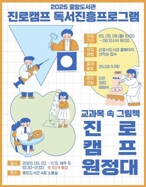 이번 진로캠프 독서진흥프로그램은 군포시에 재학 중인 초등5~6학년을 대상으로 총 8회차로 9월 20일부터 11월 15일까지 진행될 예정이다.