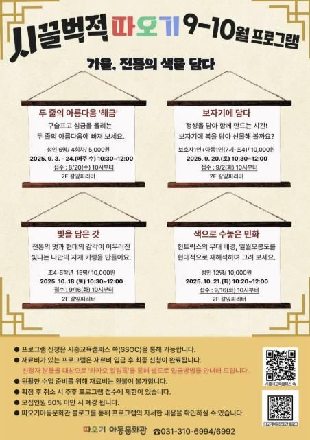[ 타임즈 - 김시창 기자 ] 시흥시 따오기아동문화관이 9월부터 10월까지 ‘전통’을 주제로 한 특별ㆍ상설프로그램을 운영한다. 이번 프로그램은 최근 흥행 중인 애니메이션 케이팝 데몬 헌터스의 인기로 높아진 전통문화 관심과 맞물려, 깊어 가는 가을에 아이들과 가족이 함께 우리 문화의 아름다움을 체험할 수 있도록 마련됐다.