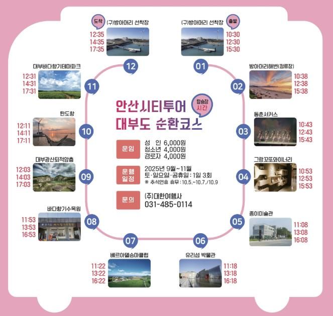 [ 타임즈 - 김시창 기자 ] 안산시는 오는 6일을 시작으로 11월까지 대부도 뱃길 운항과 연계한 안산시티투어 대부도 순환코스를 시범 운영한다고 5일 밝혔다.