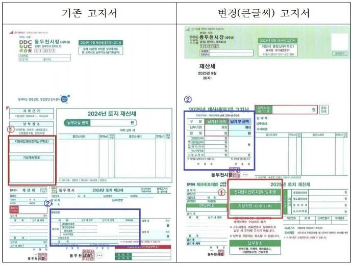 [ 타임즈 - 김시창 기자 ] 동두천시는 9월 토지분 재산세부터 고령층과 저시력 납세자를 위한 ‘큰 글씨 지방세 고지서’를 제작·발송한다고 밝혔다.