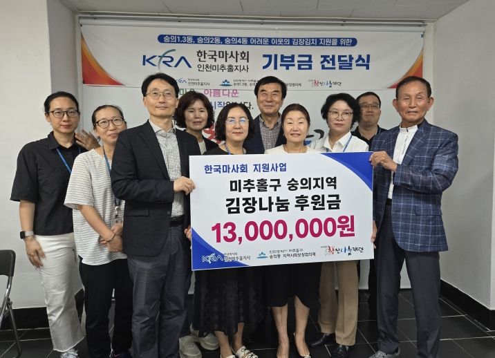 [ 타임즈 - 김시창 기자 ] 한국마사회 인천미추홀지사(지사장 조영진)는 미추홀구 숭의1·3동, 숭의2동, 숭의4동 일대 취약계층을 지원하기 위해 김장 나눔 후원금 1,300만 원을 학산나눔재단에 전달했다고 23일 밝혔다.
