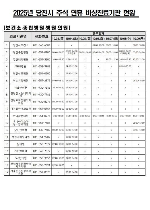연휴 기간 당진종합병원 응급실은 평소와 같이 24시간 운영되며, 1차 진료를 담당하는 병의원 50여 곳과 약국 30여 곳이 문을 연다.