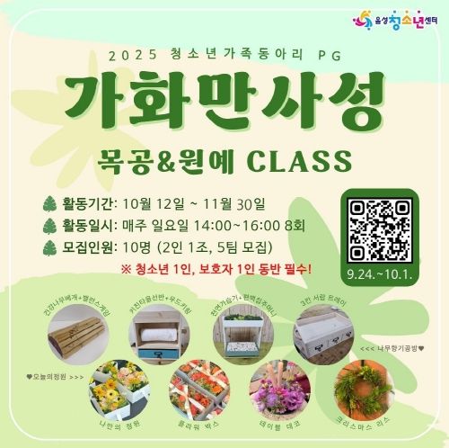 목공과 원예 활동을 통합한 프로그램으로, 10월 12일부터 11월 30일(매주 일요일 오후 2시~4시)까지 분야별로 4회차씩 진행될 예정이다.