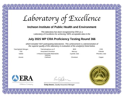 [ 타임즈 - 김시창 기자 ] 인천광역시 보건환경연구원은 미국 환경자원협회(ERA)가 주관한 2025년 환경분야 국제숙련도 평가에서 ‘최우수 등급(Laboratory of Excellence)’을 받았다고 밝혔다.